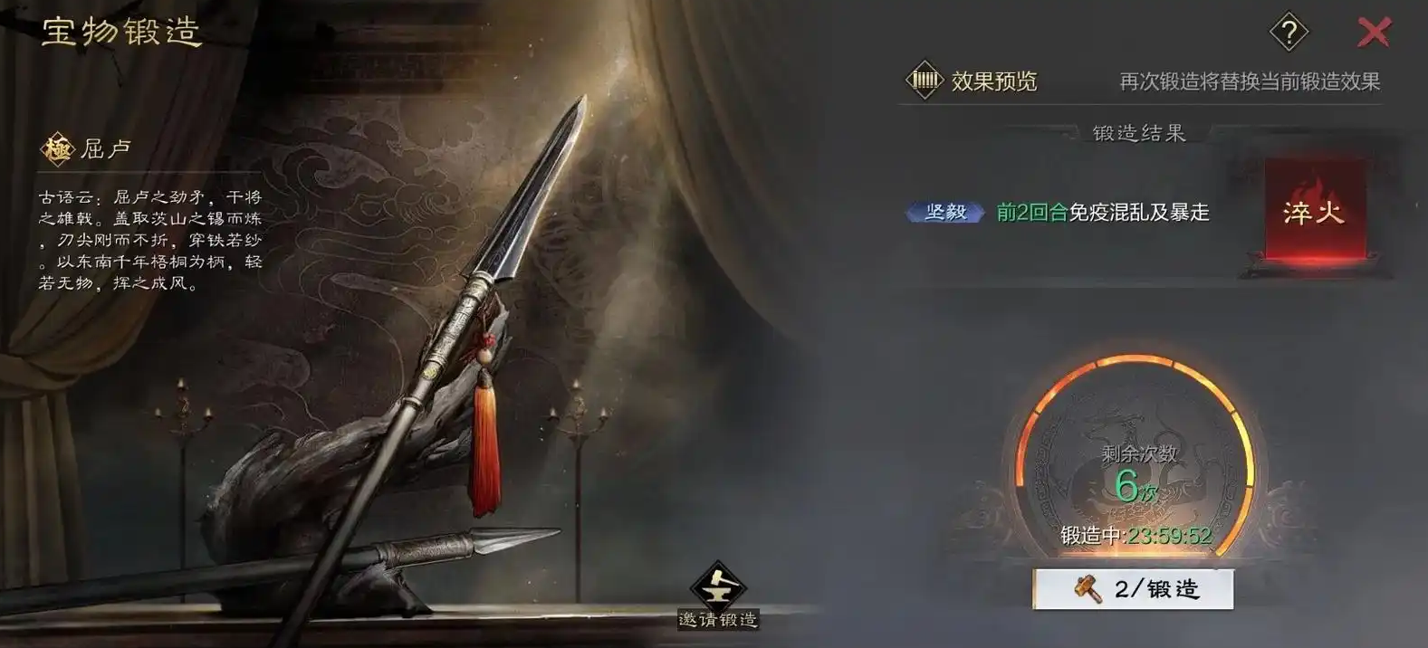 武器打造存在品质分层,普通锻造可能产出次品,而精品及以上品质的武器需通过进阶强化实现属性提升。精品武器可经由工匠多次淬炼进阶为罕俦或稀世等级,外观与名称随强化阶段改变。进阶需消耗特殊材料且依赖工匠技艺,因此建议集中资源培养核心武将的适配武器。每日打造机会有限,若对结果不满意可次日重新尝试,但需提前储备充足材料以应对连续锻造需求。