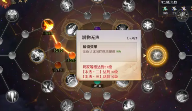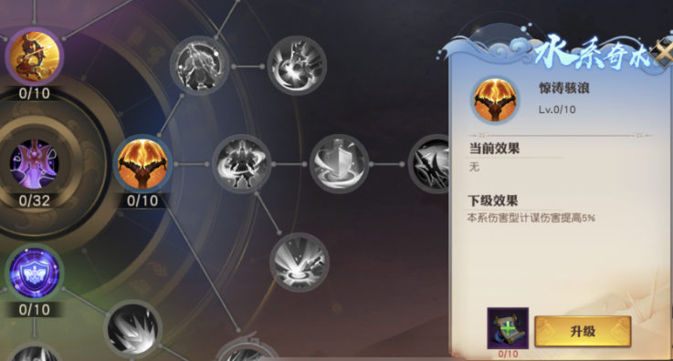 等你升到32级就能在主界面找到入口啦。进去后你会看到一个大星盘,分成风、雷、水、火四个属性区域,每个区域都有很多小节点等着点亮。点亮需要消耗计谋心得道具,这些道具平时推图做任务就能攒到。不是随便点哪个都行,有些高级节点会要求你的角色等级达标,或者必须先把相连的前置节点激活,比如想点润物无声就得先确保水法·二和水法·三都点到十级才行,所以得一步步来别着急。