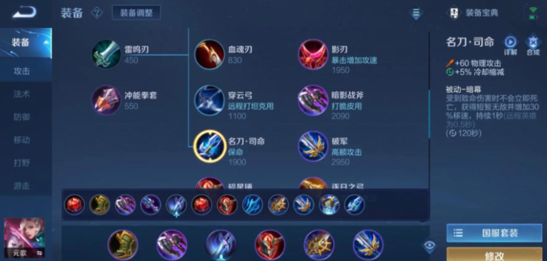 元歌的出装需适配桑启的辅助,推荐选择暗影战斧、冷静之靴、破军、宗师之力、碎星锤和不祥征兆。暗影战斧提供冷却缩减和物理穿透,帮助元歌快速刷新技能;冷静之靴进一步减CD,提升连招流畅度;破军增强残血收割能力,契合桑启的治疗支持;宗师之力强化普攻伤害,配合元歌的位移突进;碎星锤针对敌方坦克,确保输出不衰减;不祥征兆增加坦度,应对突袭。铭文搭配以祸源、鹰眼和兽痕为主,强化暴击和穿透,让元歌在桑启的草丛掩护下高效完成刺杀。