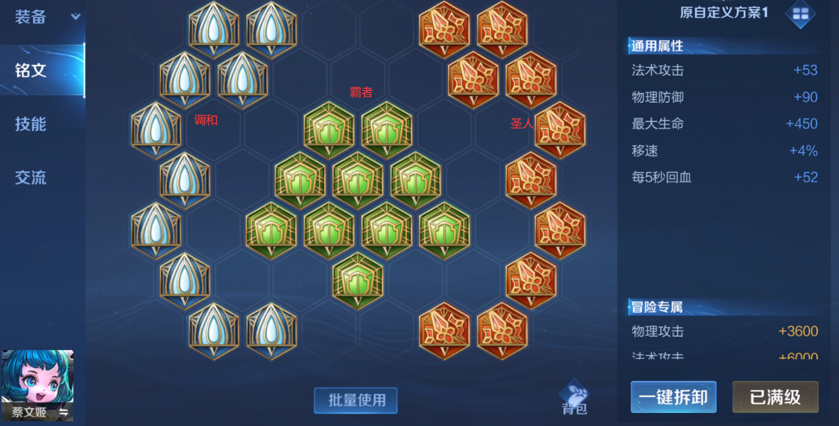 铭文配置以强化基础属性为原则,推荐10圣人、10调和、10虚空组合。该搭配提供1125点生命值、6%冷却缩减及53点法强,有效弥补逆风期属性短板。圣人铭文专注提升法强增强治疗量,调和增强续航与移速,虚空则进一步优化冷却与生命成长,三者协同支撑蔡文姬在资源匮乏期的功能性。