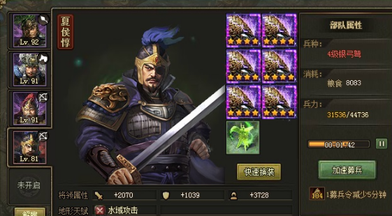既不会太难达成,也能提供可观的属性增益。咱们可以通过商店购买或者利用每天免费的洗炼机会慢慢凑齐,前期够用就行。副将系统开放后,搭配思路就更多了。给张辽配个夏侯惇或者曹仁这类防御型的副将,能很好地弥补他面对强力战法时的短板,相当于上了双保险。战车系统里,护甲堆满5格的2级战车就挺实用,火力能升到3级的话,基本能满足中后期副本的需求。