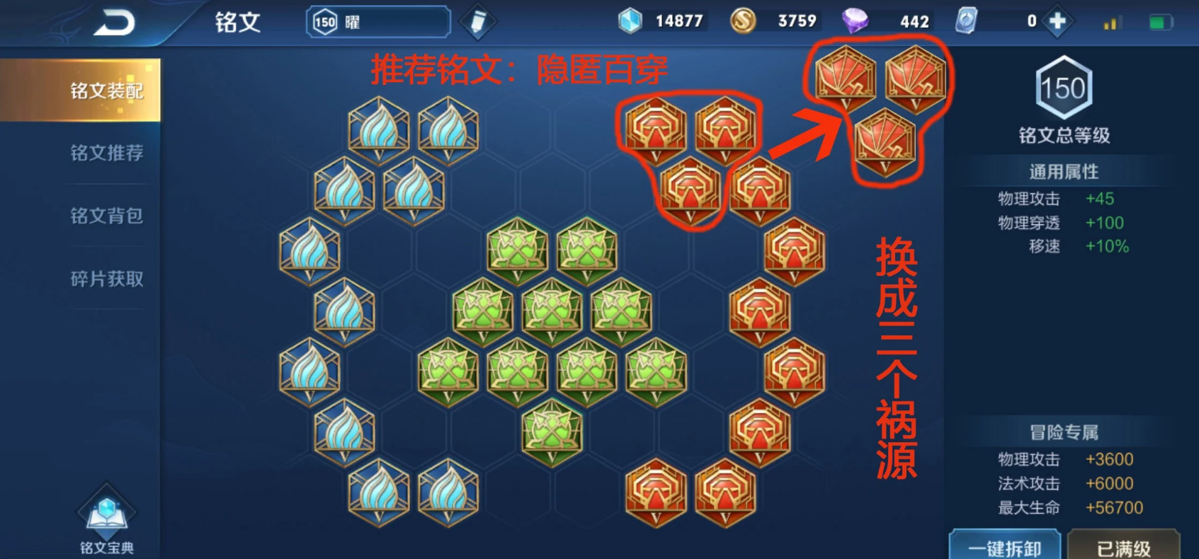 铭文配置以百穿体系为基础框架,红色异变×10与绿色鹰眼×10提供29点物理攻击和100点物理穿透,确保前期伤害充足。蓝色铭文推荐10隐匿强化移速支援效率,亦可混搭狩猎提升攻速优化手感。特殊对局中可微调:例如携带1祸源搏暴击概率,或面对强控阵容时替换部分铭文为调和,增加生命回复增强续航。