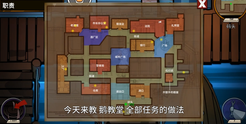 鸭子阵营的破坏任务是扭转局势的关键。广场雕像下毒需通过连线操作触发,好人需在限定时间内完成红灯区水泵换水;关门破坏位于红灯区右侧走廊,启动后全图大门关闭20秒;左上方工厂的烟雾破坏会遮挡所有玩家视野;仓库放火后鹅阵营需分工灭火。这些破坏不仅能打断任务进度,还能制造混乱便于鸭子阵营偷袭。