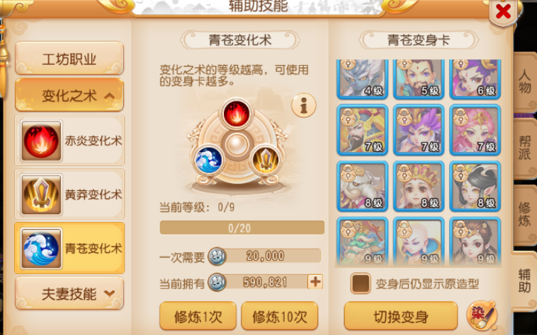 变身术分为赤炎、黄莽和青苍三种属性类别,彼此存在相生相克关系:赤炎克制黄莽,黄莽克制青苍,青苍克制赤炎。这种机制要求玩家根据角色门派和战斗场景选择合适属性,例如法系角色优先青苍,物理输出侧重赤炎。变化之术等级分为1-9级,升级需消耗银币,高级别(7-9级)还需变化之灵,解锁更强大的变身卡效果。属性相克与等级系统共同构成了变身术的策略深度,确保玩家需针对性规划升级路径。