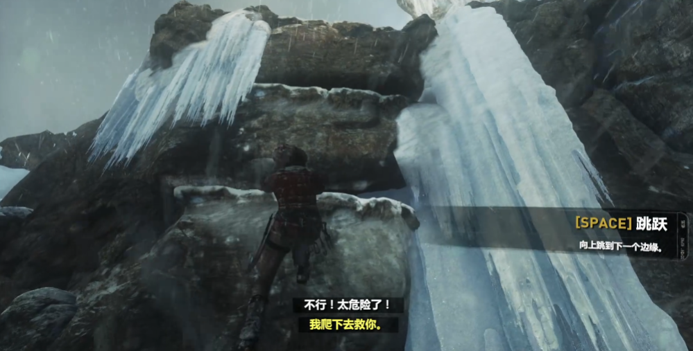 开局需要先熟悉基本操作,在雪山顶峰关卡中主要学习移动、跳跃和攀爬技巧,当劳拉悬挂在半空时要根据提示前后摇动左摇杆让她接近冰墙,在最近距离按下互动键将登山斧固定在冰墙上,这个操作需要掌握好时机才能顺利通过,爬上冰墙后很快就会触发雪崩剧情进入逃亡阶段,要快速反应完成奔跑和跳跃动作。