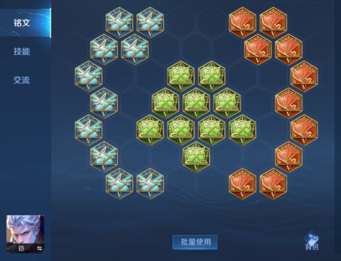 铭文方面推荐使用祸源、狩猎和鹰眼的组合。十个祸源提供暴击率加成,让铠的普攻有几率打出更高伤害。十个狩猎增加攻速和移速,提升追击能力和手感。十个鹰眼则提供物理穿透,确保对前排也能造成有效伤害。这套铭文兼顾了输出和机动性,很适合新手玩家使用。