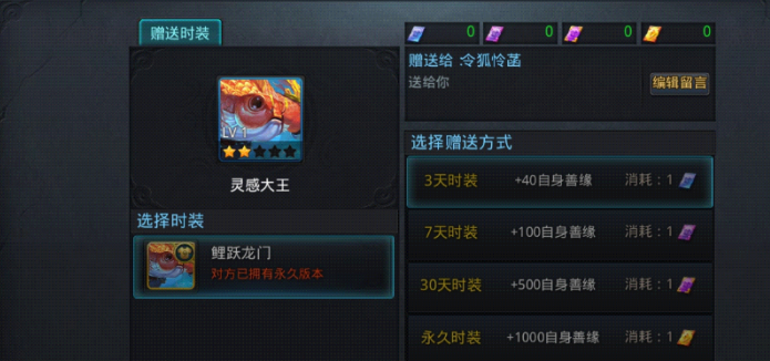 给朋友送时装首先得确保双方已经是游戏好友,而且想送的这款时装对应的英雄,咱们和朋友都得已经拥有。如果没满足这个条件,系统可不让咱们完成操作。赠送时装需要用到专门的时装赠送卡,这玩意儿分好几种时效:3天卡、7天卡、30天卡,还有最珍贵的永久卡。这些卡主要在善缘珍阁用元宝兑换,或者去凌云锦市花凌云壁换,凌云壁一般是通过充值获得的。记得不同卡有兑换限制,比如3天卡每周最多换2次,7天卡有总次数上限,永久卡通常需要较多凌云壁,所以换之前最好盘算清楚哪种最划算。