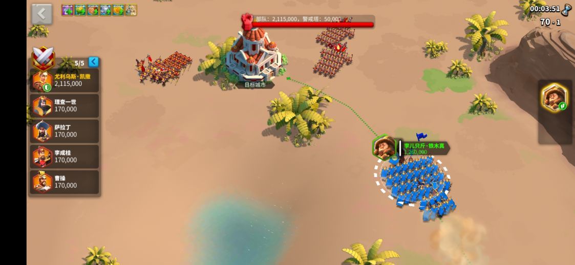 在队伍配置方面通常需要安排一队高防御的肉盾放在首位,这支队伍要负责吸引并承受主要伤害。推荐的肉盾组合包括理查配合查理,如果这两个橙色武将的强度不够也可以用孙武或西庇阿作为替代。其余四支队伍中需要配置1-2队纯输出,这些队伍应该从侧翼或后方切入战场,但必须确保在肉盾队接敌前不进入敌方警戒范围。辅助队伍则负责提供治疗和增益效果,贞德是非常适合这个位置的选择。