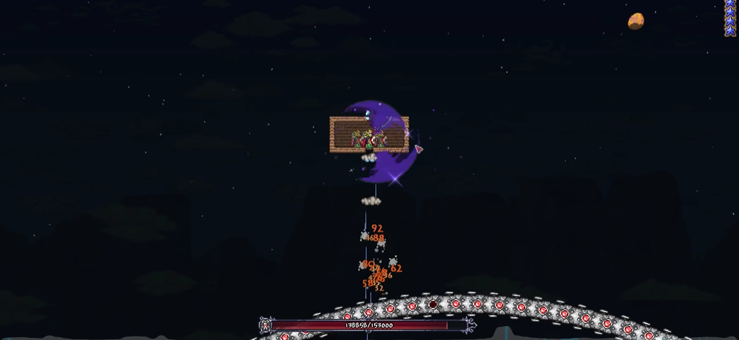 打毁灭者建议搭多层木质平台当战场,高度离地面约50格。准备至少300发陨石子弹或水晶子弹,搭配迷你鲨或大鲨鱼枪械输出。走位时保持横向移动,用勾爪快速转向躲避激光,优先清理它放出的小探测器,这些小怪既能回血又干扰走位。带好铁皮药剂和再生药剂,穿神圣套或精金套能大幅提升容错率。